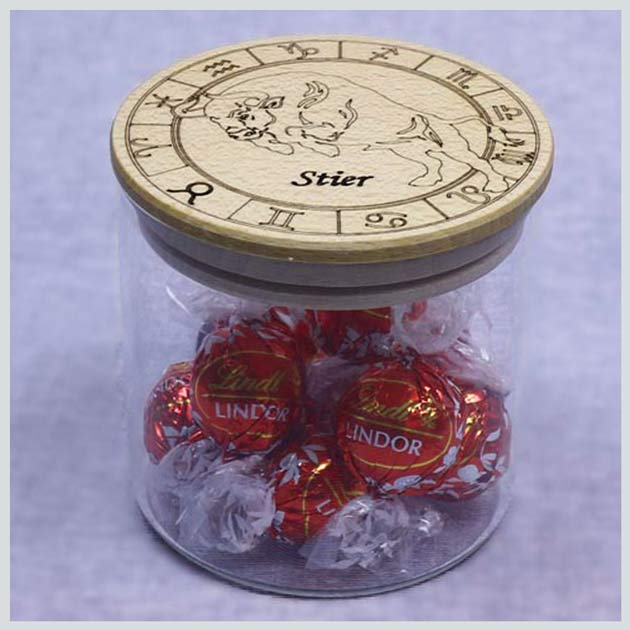 Sternzeichen “Stier” auf Buchenholz-Deckel und Glas