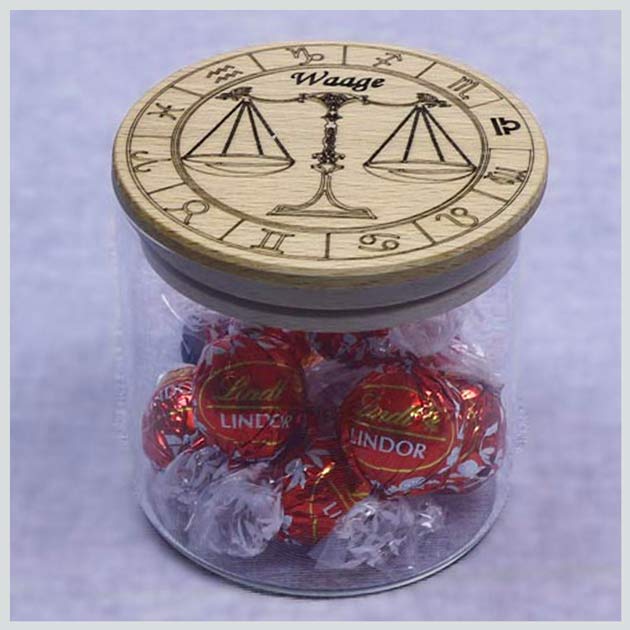 Sternzeichen “Waage” auf Buchenholz-Deckel und Glas