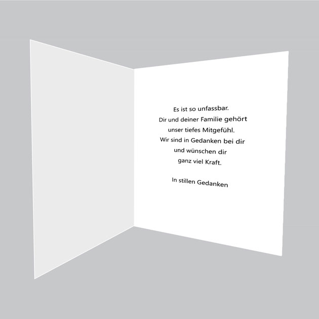Wenn eine Person stirbt, ist das ein sehr trauriges Ereignis. Wir trösten mit einem stillen Händedruck, einer längeren Umarmung oder mit einer Trauerkarte. Man kauft eine Trauerkarte und dann fehlen die richtigen, tröstenden Worte dazu. Wir von Geschenkideenshop haben den Trauerspruch “Es ist so unfassbar…” für die Innenseite und die dazu passende Trauerkarte, ist frei wählbar.